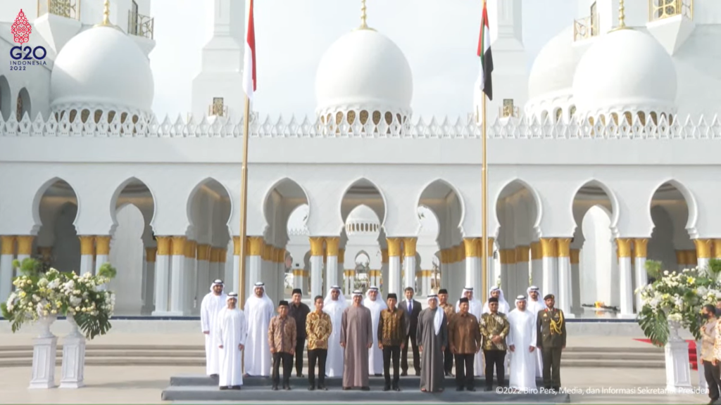 Jokowi menanam pohon di depan masjid dan kemudian melakukan foto bersama Sang Pangeran UEA bersama sejumlah pejabat lainnya. Foto tersebut diambil di depan masjid setempat.