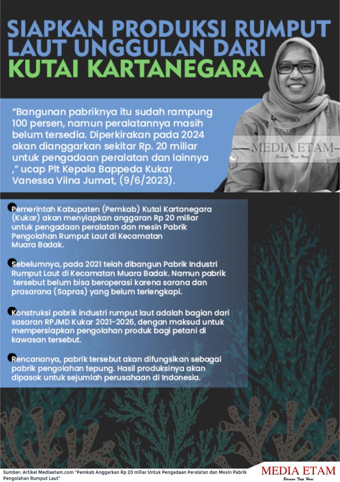 Mediaetam.com, Kukar – Pemerintah Kabupaten (Pemkab) Kutai Kartanegara (Kukar) akan menyiapkan anggaran sebesar Rp 20 miliar untuk pengadaan peralatan dan mesin yang diperlukan pada Pabrik Pengolahan Rumput Laut di Kecamatan Muara Badak.