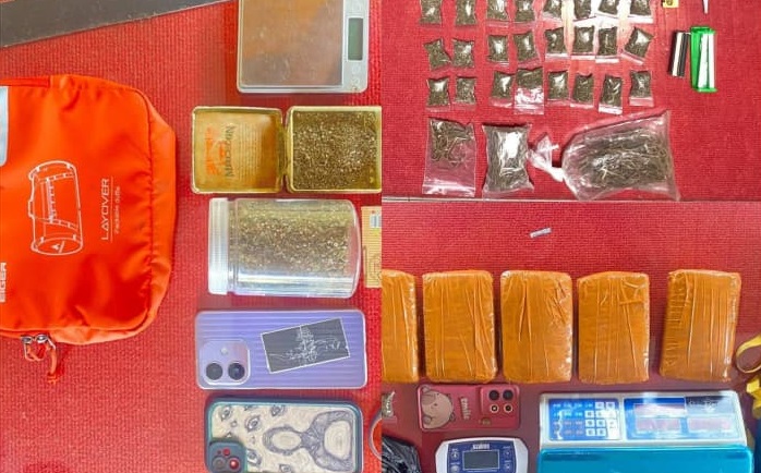 Di lokasi ini, petugas menyita toples berisi ganja seberat 185 gram, timbangan digital, serta alat pelinting rokok.