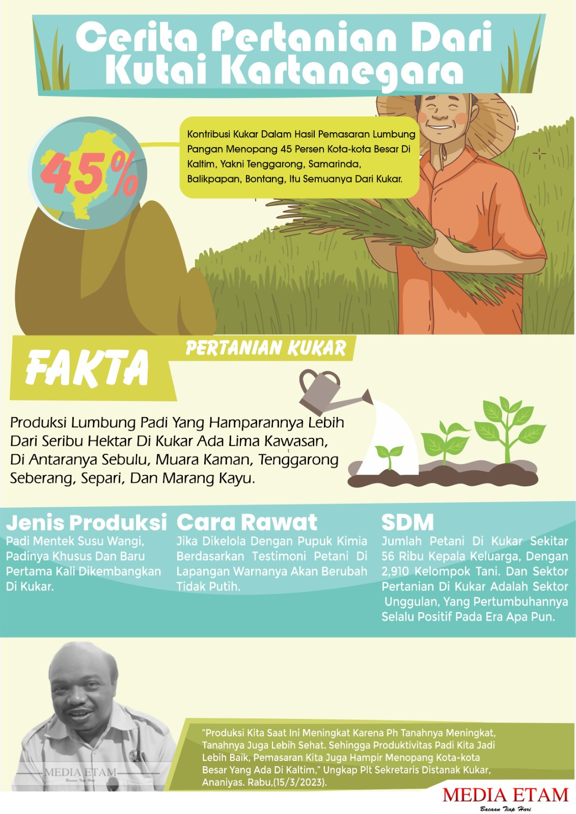 Pelaksana tugas Sekretaris Dinas Pertanian dan Peternakan (Distanak) Kukar Ananias bahwa 45 persen kontribusi Kukar dalam hasil pemasaran lumbung pangan hampir menopang kota-kota besar di Kaltim, yakni Tenggarong, Samarinda, Balikpapan, Bontang, Itu semuanya dari Kukar.